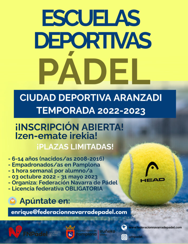 Inscríbete en la Escuela Deportiva de Pádel que la Federación Navarra de Pádel ofrece en colaboración con el Ayuntamiento de Pamplona para todos los niños y niñas en edad escolar entre 6 y 14 años (ambos inclusive), empadronados en Pamplona y cuyas sesiones se impartirán en la Ciudad Deportiva Aranzadi – Kirol Hiria