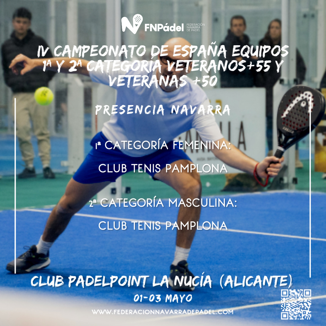 NOTA INFORMATIVA: Los equipos masculino y femenino del Club Tenis Pamplona competirán este próximo fin de semana, del 1 al 3 de mayo, en las instalaciones de Padelpoint La Nucía, en Alicante, con motivo del Campeonato de España por Equipos de 1ª y 2ª Categoría de Veteranos +55 y Veteranas +50.