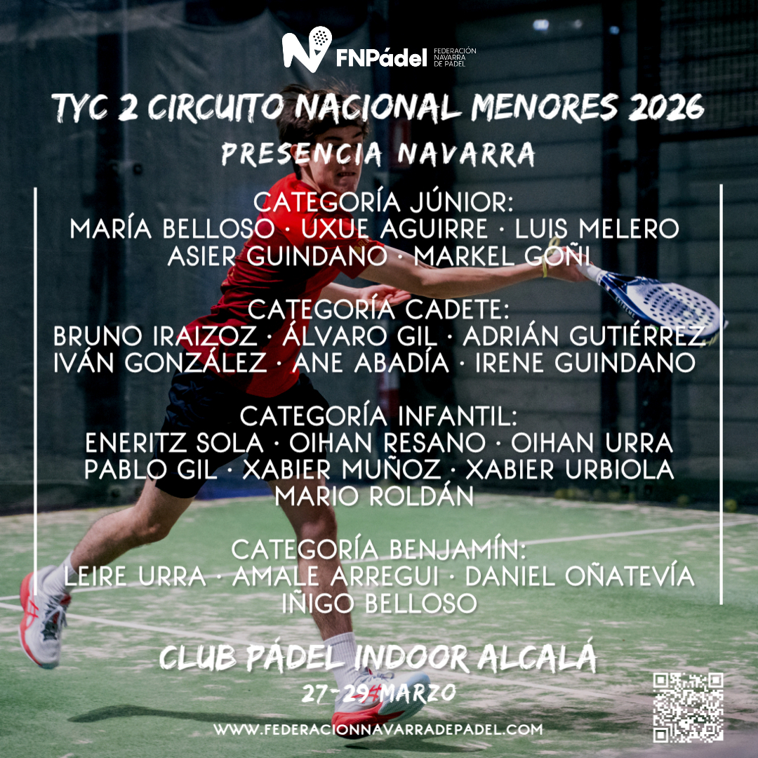 NOTA INFORMATIVA: Un total de 22 jugadores y jugadoras navarros competirán este próximo fin de semana, del 27 al 29 de marzo, en el TyC 2 del Circuito Nacional de Menores Babolat Pádel 2026, que se celebrará en las instalaciones del Club Pádel Indoor Alcalá, en Madrid.